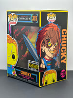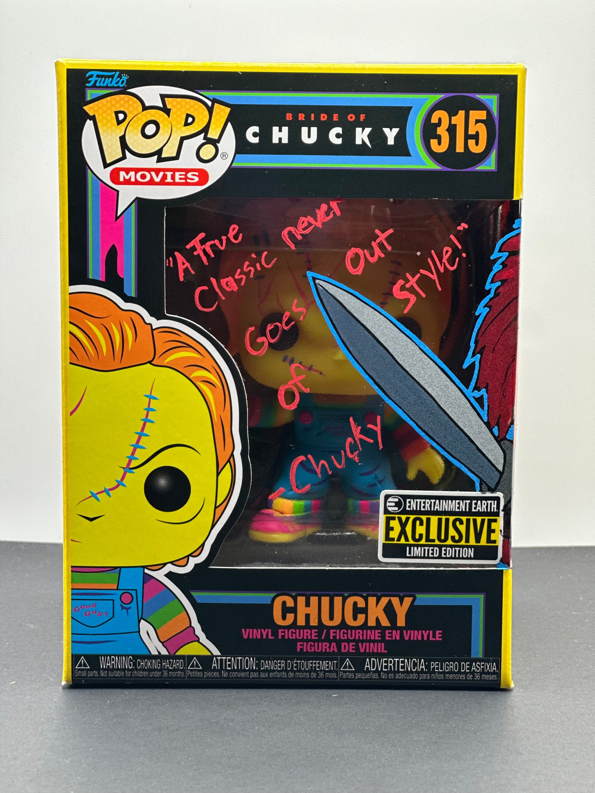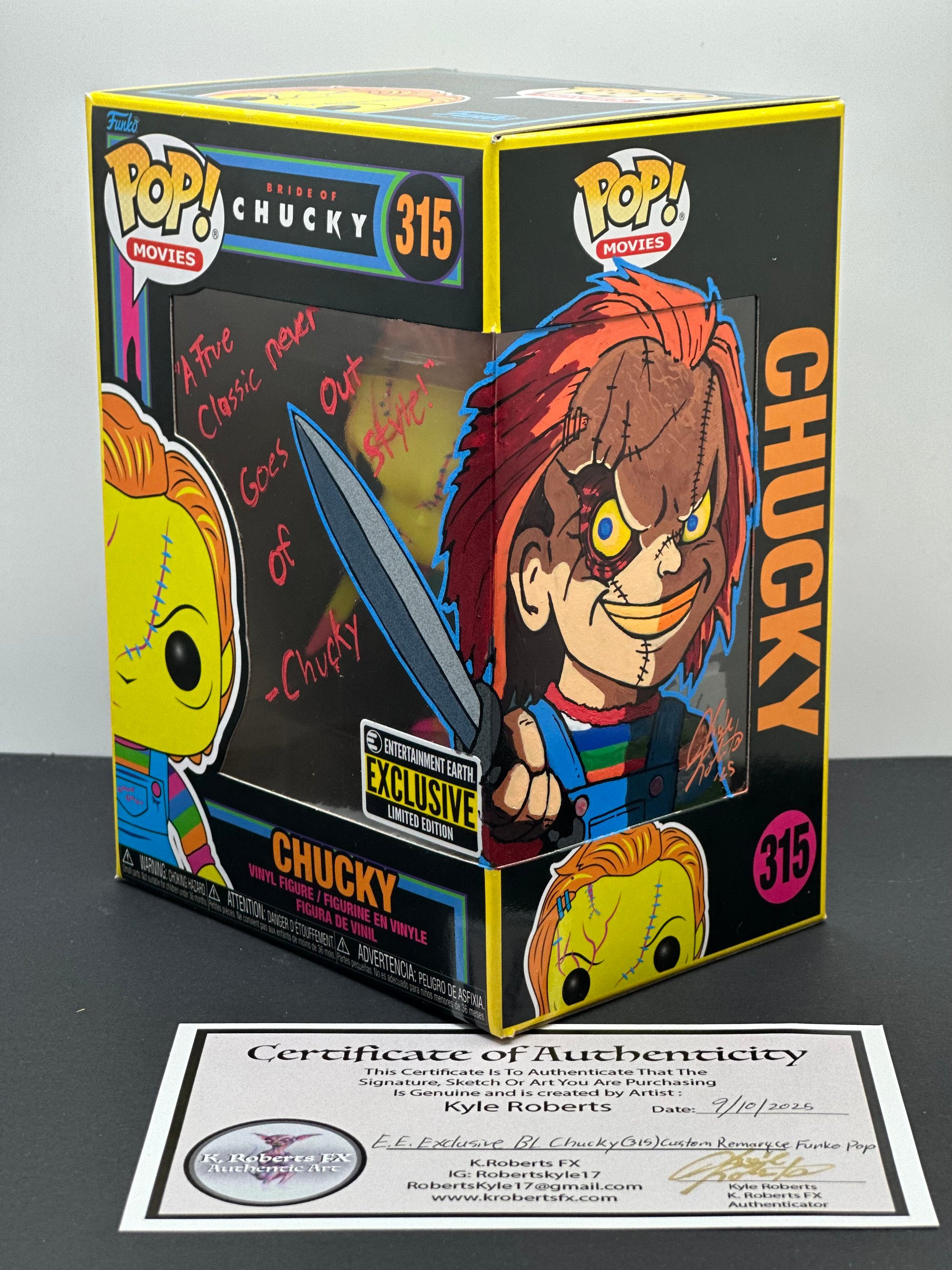 Entertainment Earth Exclusive Black Light Chucky (315) Funko Pop with custom art painted onto the box by artist Kyle Roberts. Artwork was done with water based acrylic paint markers. Comes with a pop protector and K. Roberts FX Certificate of Authenticity.