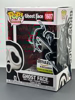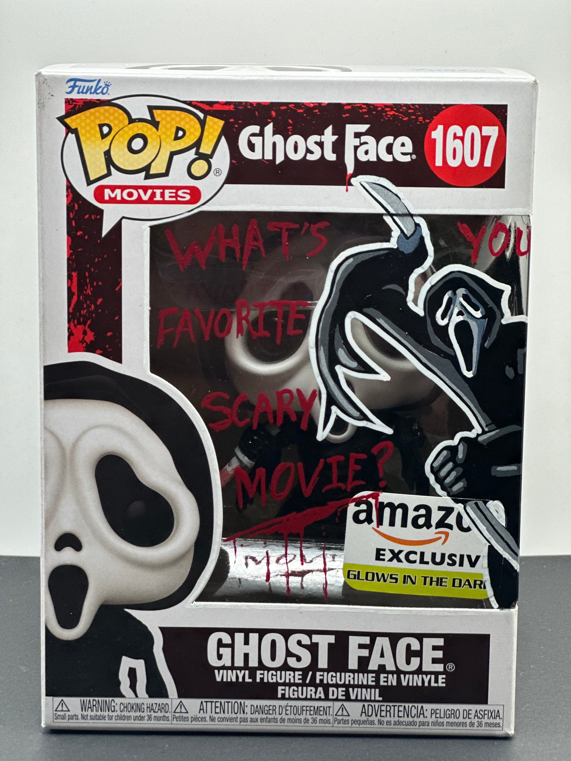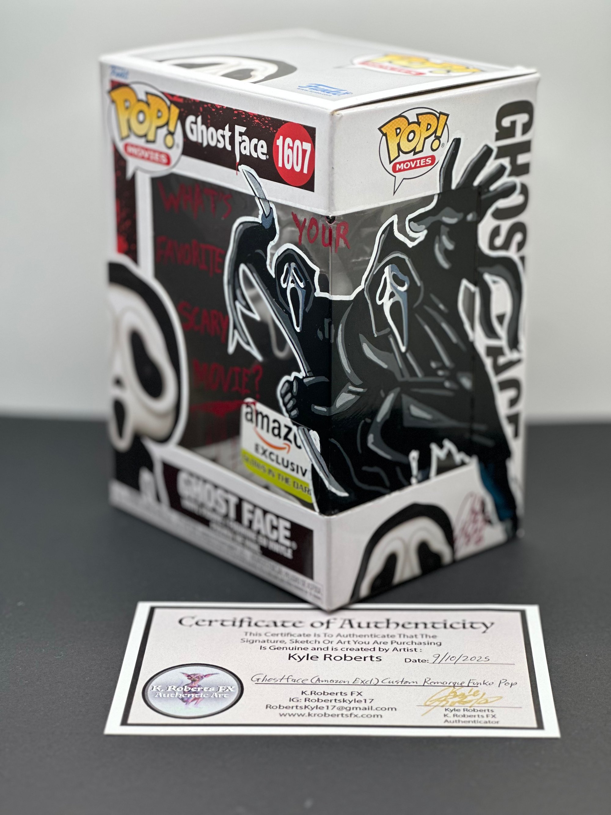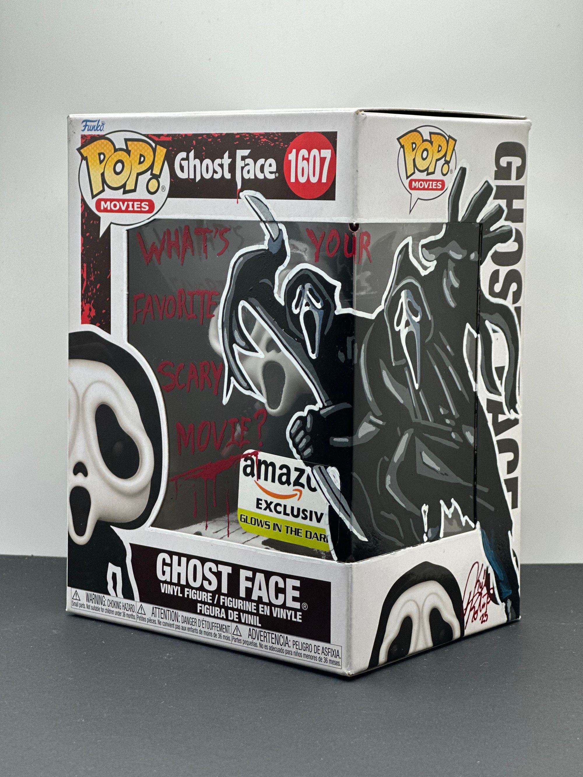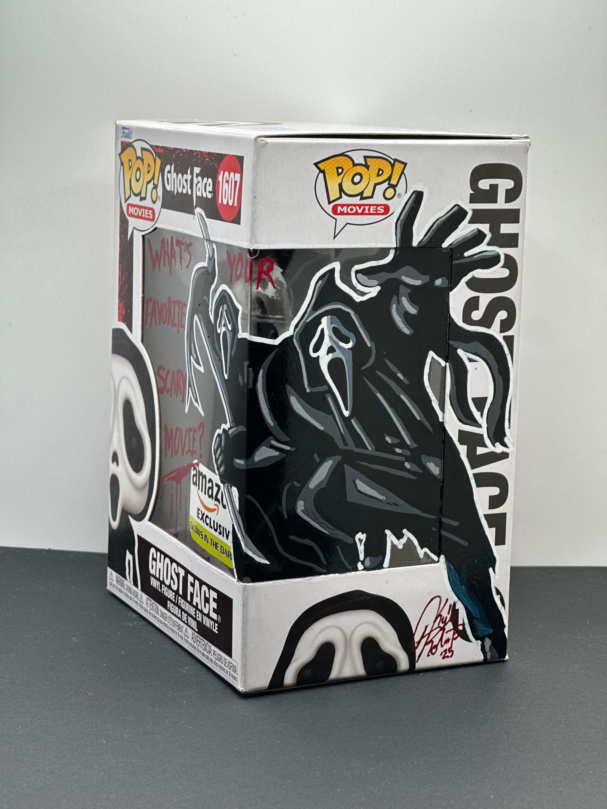 Ghostface (1607) Funko Pop with custom art painted onto the box by artist Kyle Roberts. Artwork was done with water based acrylic paint markers. Comes with a pop protector and K. Roberts FX Certificate of Authenticity.